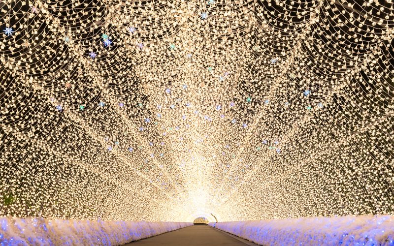 Localizado na província de Mie, o Nabana no Sato é simplesmente um dos lugares mais impressionantes do país durante o inverno. São milhões de luzes LED que cobrem jardins, lagos e túneis, criando um espetáculo visual de tirar o fôlego.