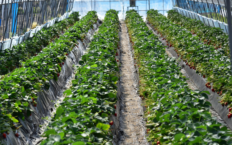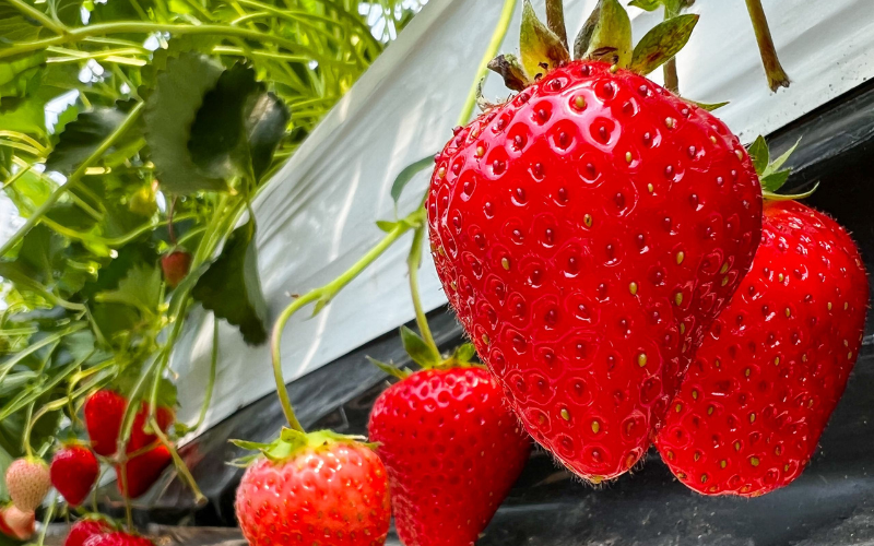 Os morangos crescem em estruturas elevadas, o que torna o passeio mais confortável para crianças, idosos e até para quem só quer curtir sem esforço.