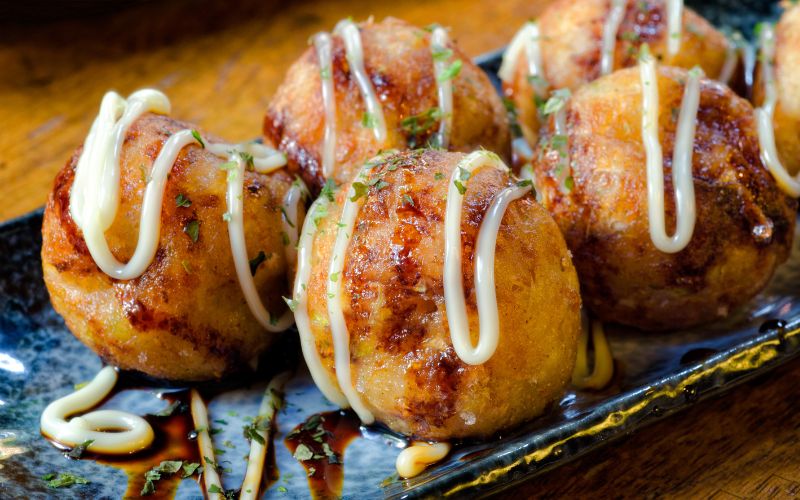 - Molho de takoyaki, maionese japonesa, aonori (alga em pó) e katsuobushi (flocos de peixe seco) para cobrir.